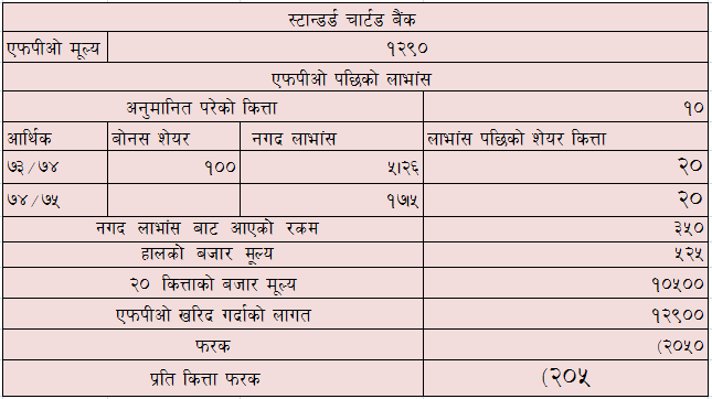 स्टान्डर्ड चार्टड बैंकले १०० रुपैयाँ अंकित मुल्यमा ११९० रुपैयाँ प्रिमियम थपी प्रति कित्ता १२९० मा थप सार्वजनिक निस्काशन गरेको थियो । उदाहरणको लागि त्यो बेला तपाईले १० कित्ता एफपीओ पार्नु भएको थियो भने तपाई अहिले २०५० रुपैयाँ नोक्सानीमा हुनुहुन्छ भने प्रति कित्ता २०५ रुपैया नोक्सानीमा हुनुहुन्छ ।