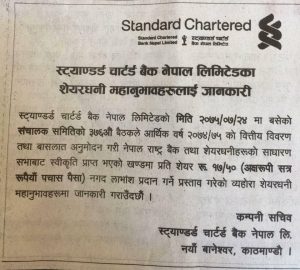 स्ट्याण्डर्ड चार्टर्ड बैंकले नगद लाभांश दिने भएको छ । बैंकको कात्तिक २४ मा बसेको सञ्चालक समितिको ३६७ औं बैठकले आर्थिक वर्षको आम्दानि बाट शेयरधनीहरु लाई १७.५० प्रतिशत नगद लाभांश दिने निर्णय गरेको हो ।