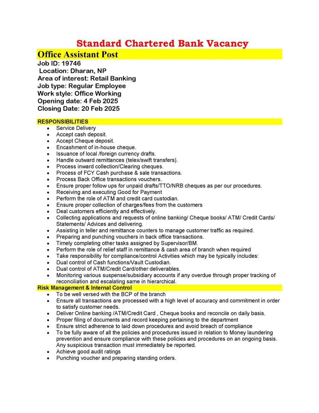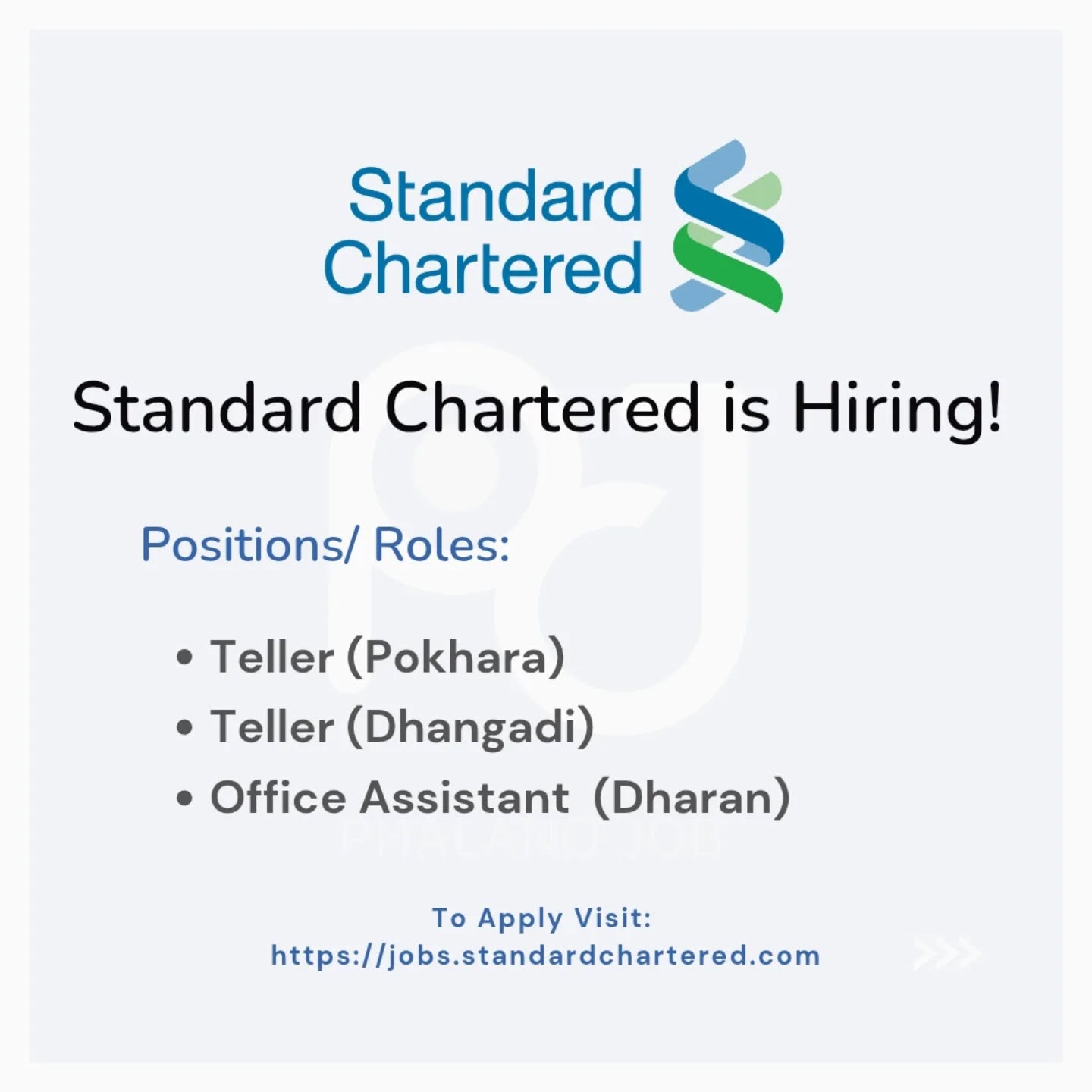 काठमाडौं । स्ट्याण्डर्ड चार्टर्ड बैंकले विभिन्न पदका लागि कर्मचारी माग गरेको छ । बैंकले धरानका लागि कार्यालय सहायक, पोखरा र धनगढीका लागि ‘टेलर’ पदमा कर्मचारी माग गरेको हो।