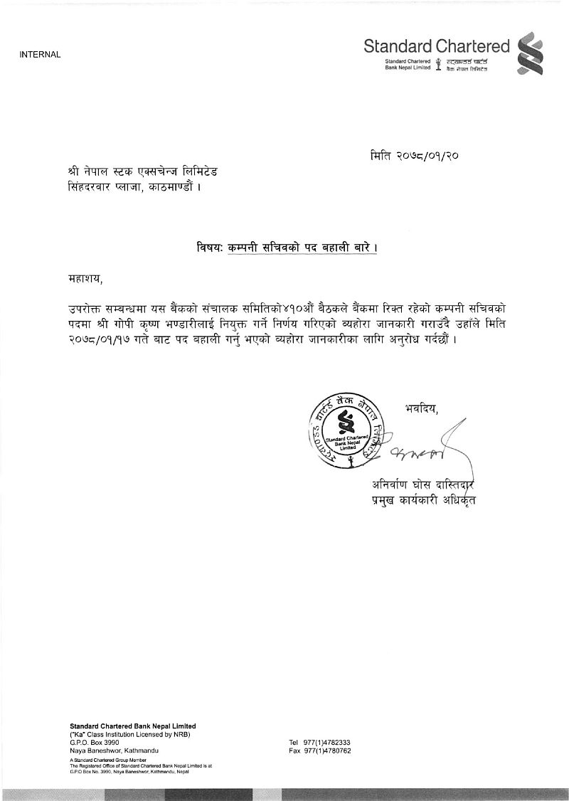 काठमाडौं । स्ट्याण्डर्ड चार्टर्ड बैंक लिमिटेडको कम्पनी सचिवमा गोपी कृष्ण भण्डारी नियुक्त भएका छन् । कम्पनीको सञ्चालक समितिको ४१०औं बैठकले उक्त निर्णय गरेको हो ।