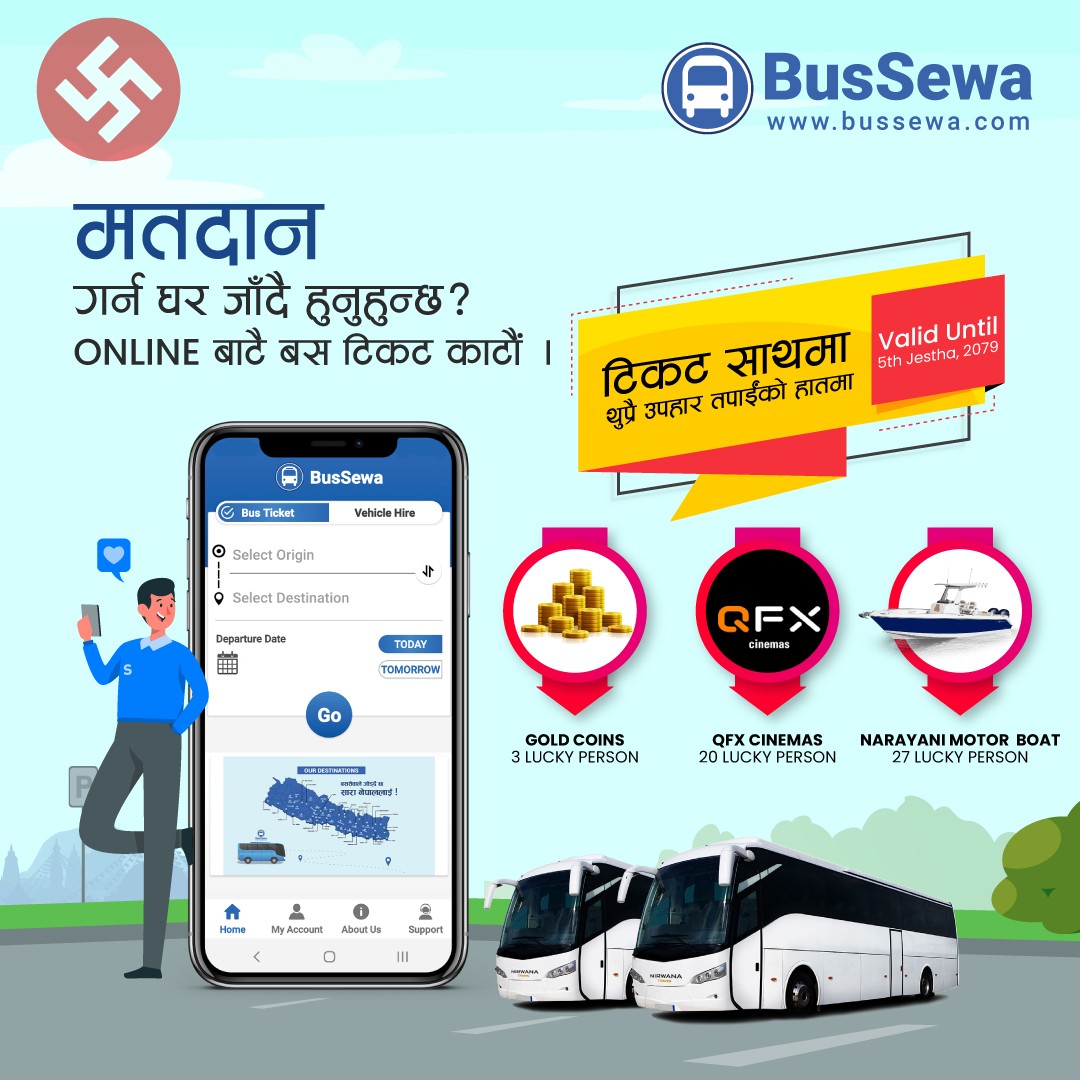काठमाडौं । बैशाख ३० गते हुने स्थानीय तहको निर्वाचनमा मतदानका लागि जाने यात्रुलाई लक्षित् गर्दै बससेवाले विशेष अफर सार्बजनिक गरेको छ । अफर अन्तरगत बससेवा डटकम मार्फत अनलाइन टिकट बुकिङ्ग गर्ने यात्रुले सुनको असर्फी जित्न सक्नेछन् ।