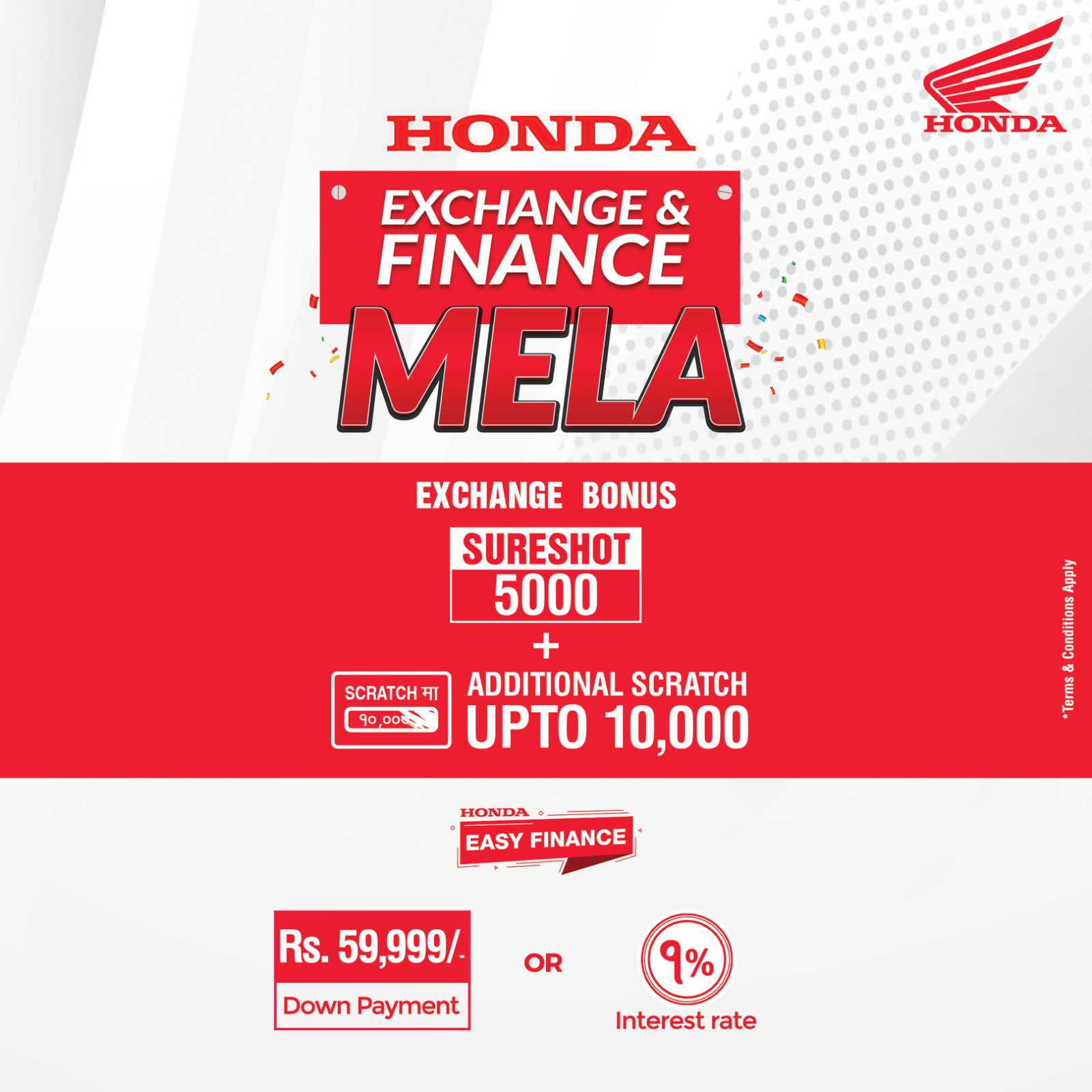मेलामा, आफ्नो पुरानो बाईक संग होण्डको कुनै पनि नयाँ बाईक साट्दा उच्च मूल्यांकन रकमका साथमा तुरुन्तै ५ हजार एक्सचेन्ज बोनस पनि पाइनेछ र साथमा १० हजारसम्मको आकर्षक स्क्र्याच कुपनले पनि धेरै भन्दा धेरै ग्राहक लाभान्वित भईरहेका छन्।