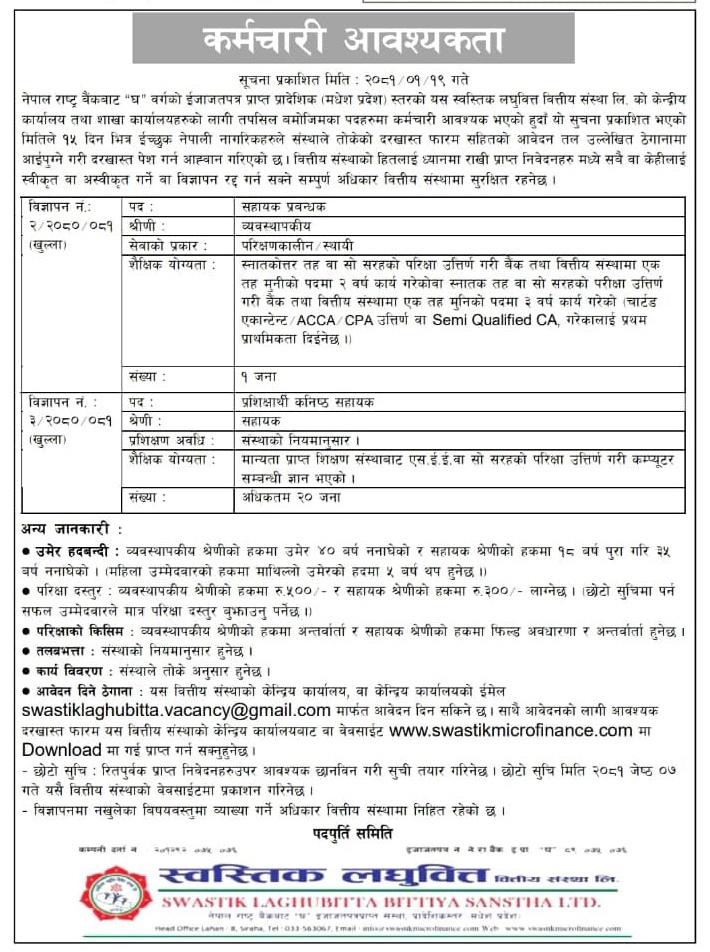 काठमाडौं । स्वस्तिक लघुवित्त वित्तीय संस्थाले कर्मचारी माग गरेको छ । यस लघुवित्तले सहायक प्रबन्धकका लागि १ जना, प्रशिक्षार्थी कनिष्ठ सहायकका लागि २० जना कर्मचारी माग गरेको छ । कम्पनीले आफ्नो केन्द्रीय कार्यालय तथा शाखा कार्यालयका लागि कर्मचारी माग गरेको छ । ईच्छुक तथा योग्यता जेठ ७ गतेभित्र आवेदन दिनुपर्नेछ ।