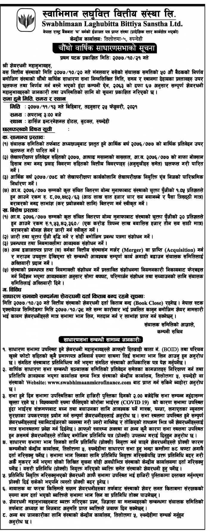 काठमाडौं । स्वाभिमान लघुवित्त वित्तीय संस्था लिमिटेडले वार्षिक साधारण सभा आह्वान गरेको छ । संस्थाको माघ २० गते, मंगलबार बसेको सञ्चालक समितिको बैठकले गरेको निर्णय अनुसार संस्थाको चौँथो वार्षिक साधारण सभा आज फागुन १३ गते, गर्ने भएको छ । उक्त सभा डार्सिज इन्टरनेशनल होटल, बुटवल, रूपन्देहीमा अपरान्ह ३ बजेदेखि सुरू गर्ने संस्थाले जनाएको छ ।