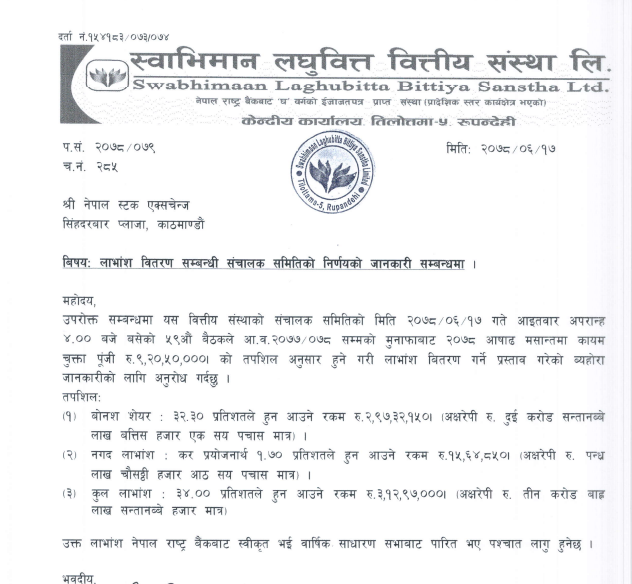 काठमाडौं । स्वाभिमान लघुवित्तले लाभांश प्रस्ताव गरेको छ । कम्पनीको आज आइतबार बसेको संचालक समितिको बैठकले आर्थिक वर्ष ७७/७८ को मुनाफाबाट आफ्ना शेयरधनीलाई कुल ३४ प्रतिशत लाभांश वितरण गर्ने प्रस्ताव गरेको हो ।