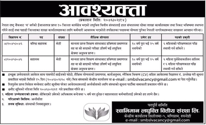स्वाभिमान लघुवित्त वित्तीय संस्थाले विभिन्न पदका लागि कर्मचारीको माग गरेको छ । संस्थाले बरिष्ठ सहायकका लागि केही र सहायक पदका लागि केही संख्यामा कर्मचारीको माग गरेको हो ।