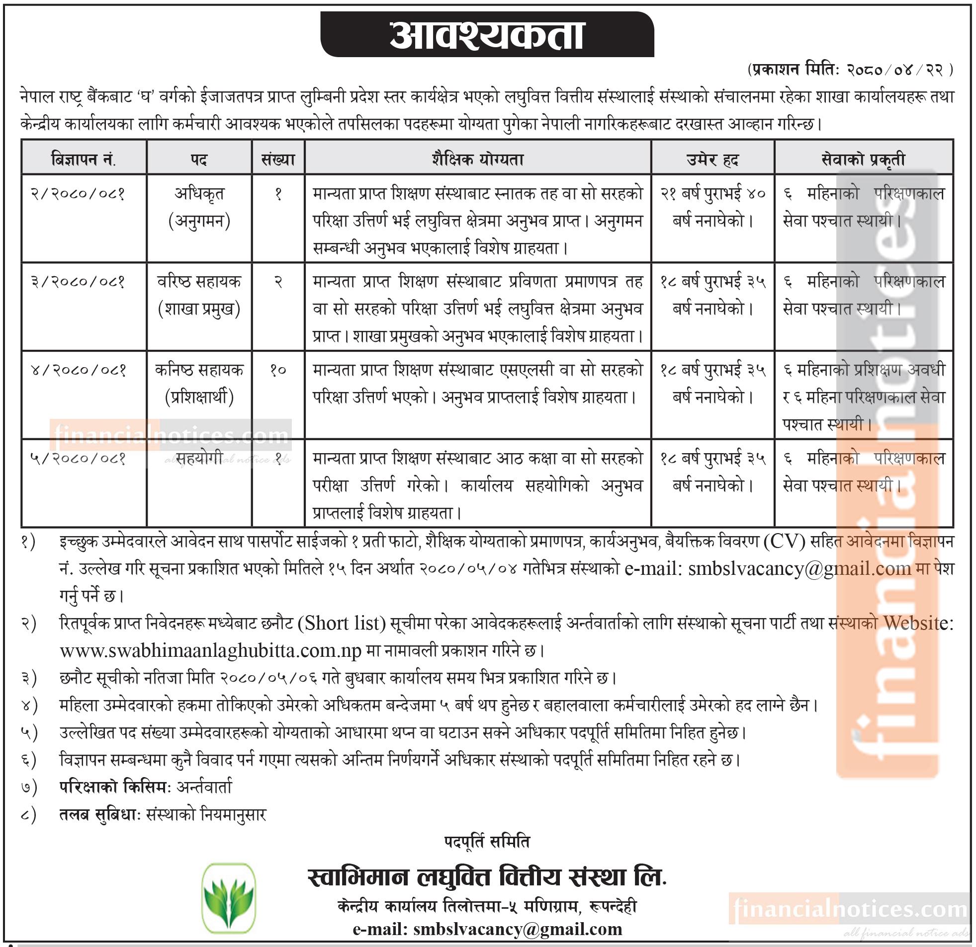 काठमाडौं । स्वाभिमान लघुवित्त वित्तीय संस्थाले ४ पदको लागि कर्मचारी माग गरेको छ । कम्पनीले अधिकृत पदको लागि १ जना, वरिष्ठ सहायकको लागि २ जना, कनिष्ठ सहायकको लागि १० जना र सहयोगी १ जना गरी जम्मा १४ जना कर्मचारी माग गरेको हो ।