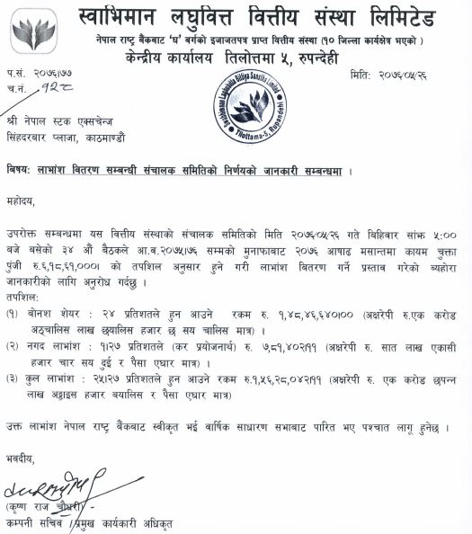 स्वाभिमान लघुवित्तले प्रस्ताव गर्यो २४% बोनश, साथमा नगद पनि