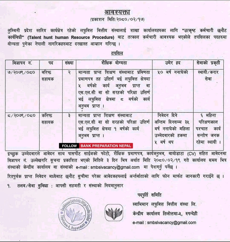 काठमाडौं । स्वाभिमान लघुवित्त वित्तीय संस्थाले कर्मचारी माग गरेको छ । कम्पनीले वरिष्ठ सहायकका लागि २ जना र कनिष्ठ सहायकका लागि ३ जना गरी ५ जना कर्मचारी माग गरेको हो । ईच्छुक तथा योग्यता पुगेकाले भोलि जेठ १९ गतेभित्र आवेदन दिनुपर्नेछ ।