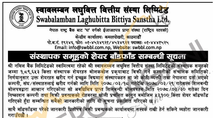 काठमाडौं । नबिल बैंकको स्वामित्वमा रहेको स्वावलम्बन लघुवित्त वित्तीय संस्था लिमिटेडको लिलामी शेयर बाँडफाँड भएको छ । कम्पनीले १ लाख ८९ हजार ६५३ कित्ता संस्थापक शेयर विक्रीका लागि असार १८ गतेदेखि २९ गतेसम्म बोलपत्र आव्हान गरेको थियो । उक्त अवधिमा प्राप्त बोलपत्रदाताहरुलाई ५३ हजार १०० कित्ता शेयर बाँडफाँड गरिएको हो ।