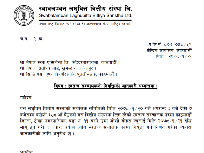 काठमाडौं । स्वावलम्बन लघुवित्त वित्तीय संस्था लिमिटेडको रिक्त रहेको स्वतन्त्र सञ्चालक पदमा उमा जोशी बोहरा नियुक्त भएकी छिन् । कम्पनीको बैशाख २० गते बसेको सञ्चालक समितिको बैठकले उक्त निर्णय गरेको कम्पनीले जनाएको छ ।