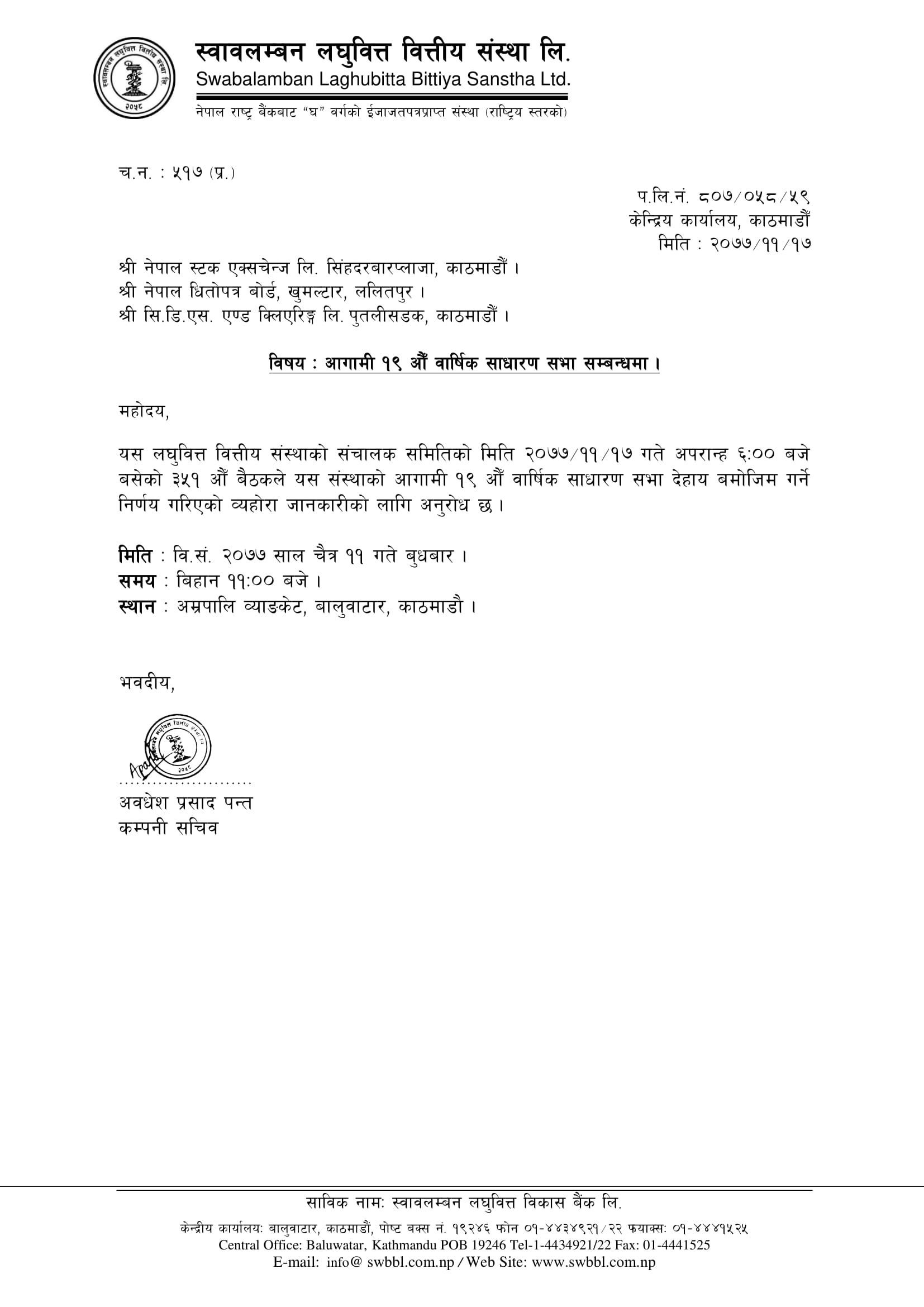काठमाडौं । स्वावलम्बन लघुवित्त वित्तीय संस्था लिमिटेडले वार्षिक साधारण सभा आह्वान गरेको छ । संस्थाको फागुन १७ गते, सोमबार बसेको सञ्चालक समितिको बैठकले गरेको निर्णय अनुसार संस्थाको उन्नाइसौँ वार्षिक साधारण सभा चैत्र ११ गते, बुधबार, अम्रपाली ब्याङ्क्वेट, बालुवाटार, काठमाडौँमा बिहान ११ बजेदेखि सुरू गर्ने जनाएको छ ।