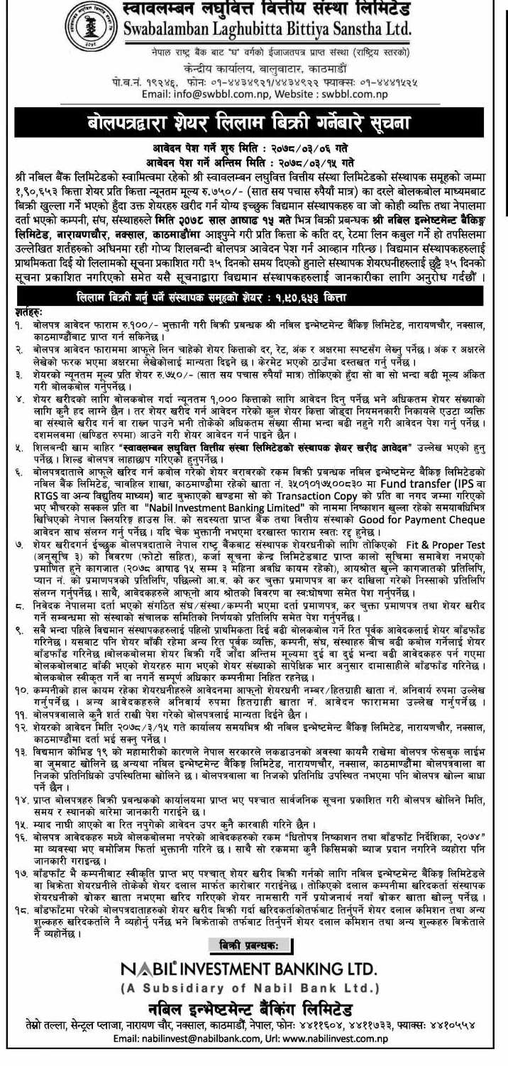 शेयर विक्री प्रबन्धकमा नबिल इन्भेष्टमेण्ट बैंकिङ्ग लिमिटेड रहेको छ । बोलपत्र नबिल इन्भेष्टमेन्ट बैंकिङ्ग लिमिटेड, नारायणचौर, नक्साल, काठमाडौंमा आइपुग्ने गरी पेश गर्नुपर्नेछ ।