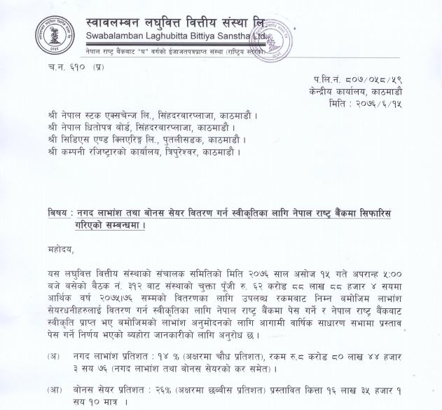 सञ्चालक समितिको निर्णय अनुमोदनका लागि नेपाल राष्ट्र बैंक र आगामी वार्षिक साधारण सभामा पेश गरिने स्वावलम्बनले जनाएको छ ।