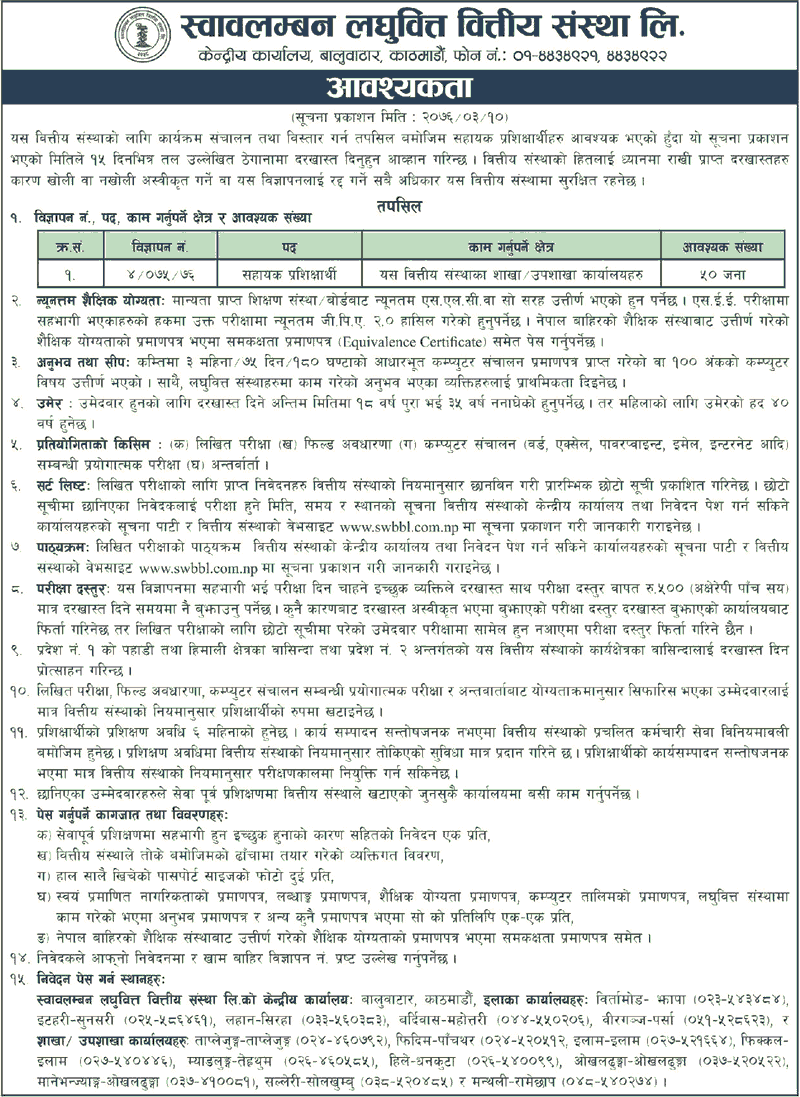 स्वावलम्बन लघुवित्त वित्तीय संस्थालले विभिन्न पदमा कर्मचारी माग गरेको छ । लघुवित्तले आफ्ना विभिन्न शाखा तथा उपशाखा कार्यालयहरुका लागि सहायक प्रशिक्षार्थी पदमा ५० जना कर्मचारी माग गरेको हो ।