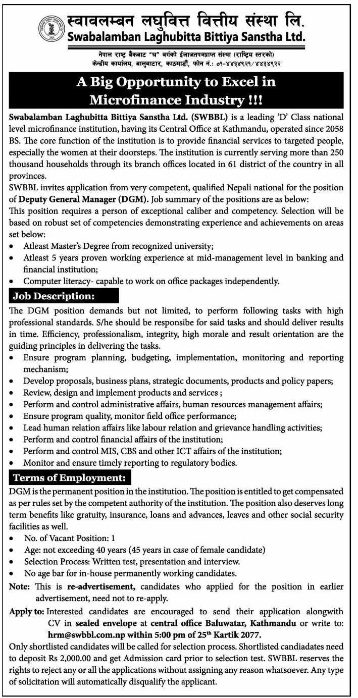 काठमाडौं । स्वावलम्बन लघुवित्त वित्तीय संस्था लिमिटेडले कर्मचारीको माग गरेको छ । संस्थाले उप महाप्रबन्धक पदको लागि एक जना कर्मचारीको माग गरेको जनाएको छ ।