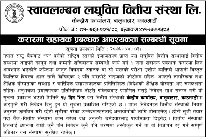 स्वावलम्बन लघुवित्त वित्तयि संस्थाले कर्मचारीको माग गरेको छ । संस्थाले करारमा सहायक प्रबन्धकका लागि कर्मचारीको माग गरेको हो । संस्थाले सो पदमा १ जना कर्मचारीको माग गरेको हो ।