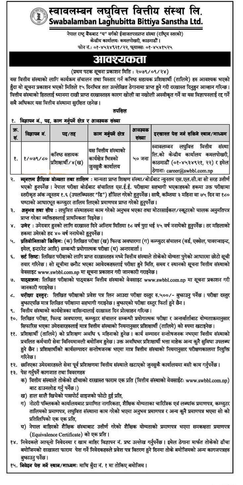 काठमाडौं । स्वावलम्वन लघुवित्त संस्था लिमिटेडले कमृचारीको माग गरेको छ । कम्पनीले एक सुचना जारी गर्दै कनिष्ठ सहायक प्रशिक्षार्थि पदमा ५० जना कर्मचारी माग गरेको जनाएको छ । उक्त पदमा आवेदन दिनका लागि न्युनतम एसएलसी उत्तिर्ण गरेको हुनुपर्ने जनाएको छ । ईच्छुक तथा योग्यता पुगेकाले सुचना प्रकाशित भएको मितिले १५ दिनभित्र बैंकिङ समयसम्म आवेदन दिइसक्नुपर्नेछ । अथवा थप जानकारीको लागि कम्पनीमा सम्पर्क गर्न आग्रह गरेको छ ।