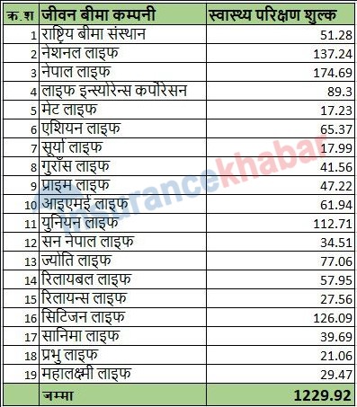 गत आर्थिक वर्षमा १९ जीवन बीमा कम्पनीहरुले स्वास्थ्य परिक्षणका लागि १२ अर्ब २९ करोड रुपैयाँ खर्च गरेका छन् । जस मध्ये सबैभन्दा धेरै नेपाल लाइफले एक करोड ७४ लाख रुपैयाँ खर्च गरेको छ । त्यस्तै नेशनल लाइफले एक करोड ३७ लाख रुपैयाँ, सिटिजन लाइफ एक करोड २६ लाख रुपैयाँ, युनियन लाइफ एक करोड १२ लाख रुपैयाँ खर्च गरेका छन् ।