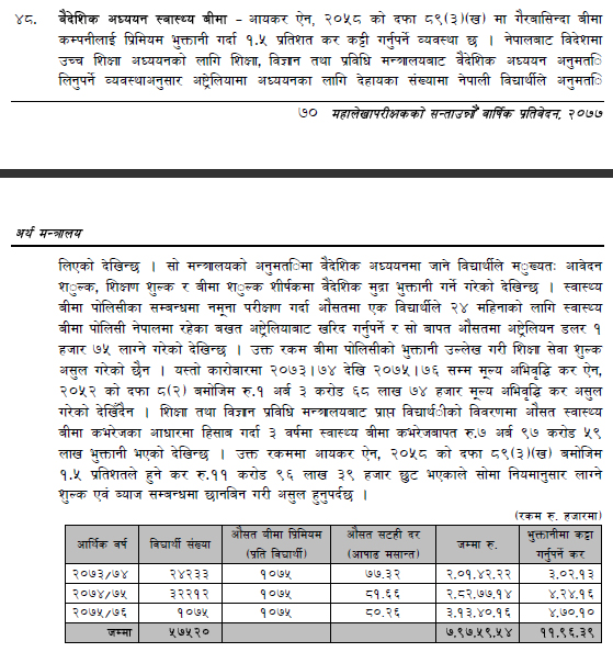 महालेखा परिक्षकको कार्यालयले ५७ औं बार्षिक प्रतिवेदनमा बैदेशिक अध्ययनको क्रममा अष्ट्रेलिया जाने विद्यार्थीहरुबाट आर्थिक वर्ष २०७३।०७४ देखि २०७५।०७६ सम्ममा कूल ७ अर्ब ९७ करोड ५९ लाख रुपैयाँ स्वास्थ्य बीमा बापत लिई अस्ष्ट्रेलिया पठाइएको उल्लेख छ । नेपालमै रहेका विद्यार्थीको २४ महिनाको स्वास्थ्य बीमा गराई अस्ट्रेलियामा सो रकम पठाएको तर सो कारोबारमा नेपालमै हुँदा समेत नेपाल सरकारले पाउनुपर्ने १३ प्रतिशत भ्याट र आयकर छली गरिएको महालेखाको ठहर छ । महालेखाले एक अर्ब तीन करोड ६८ लाख ७४ हजार रुपैयाँ भ्याट छली भएको तथा आयकर ऐन २०५८ अनुसार १.५ प्रतिशतको आयकर बापत ११ करोड ९६ लाख रुपैयाँ समेत नेपाल सरकारको खातामा जम्मा नभएकोले सो कारोबारमा संलग्न व्यक्तिहरु खोजी कारवाही गर्न भनिएको छ ।