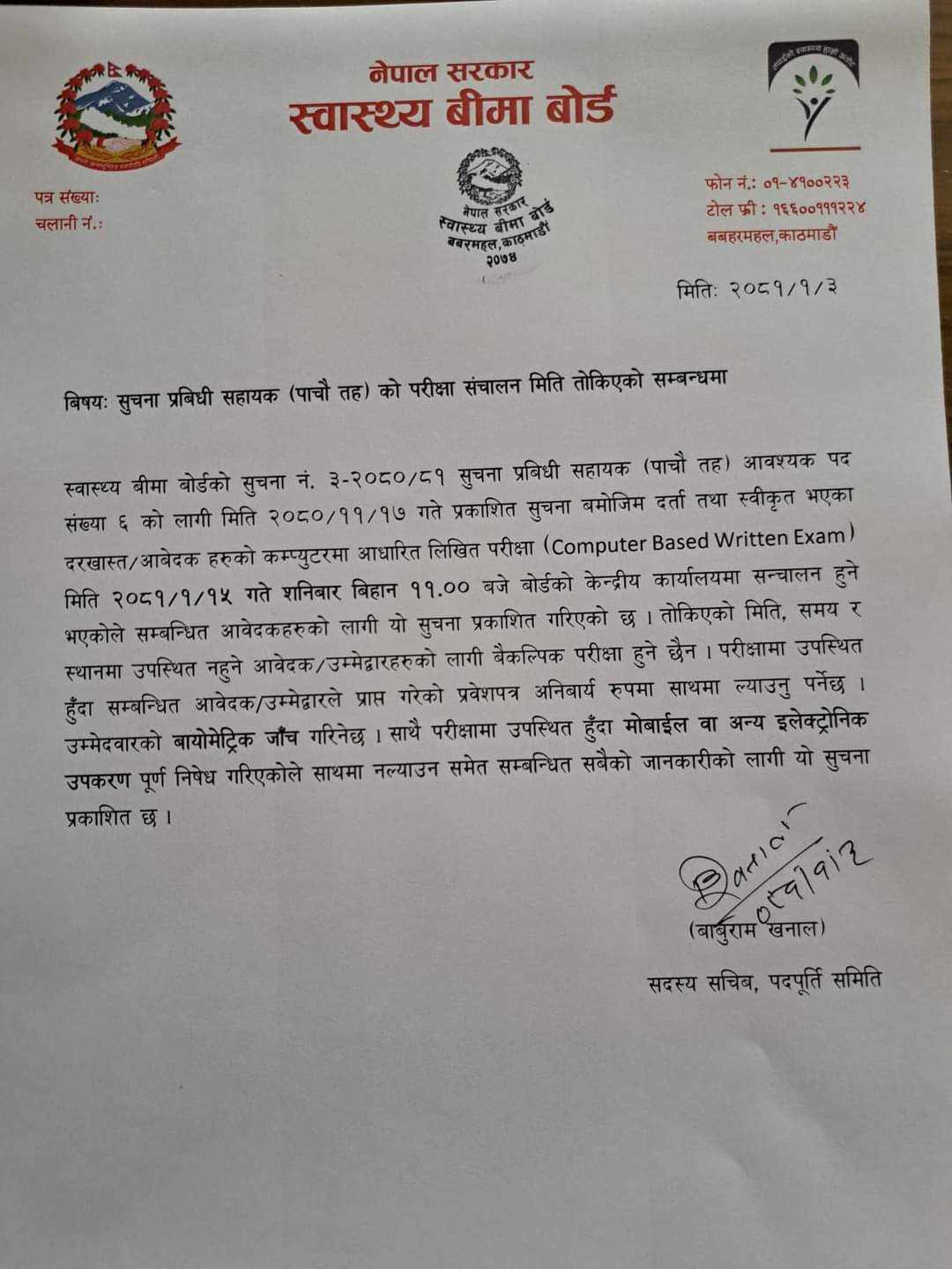 काठमाडौं । स्वास्थ्य बीमा बोर्डको पाँचौँ तहको लिखित परीक्षाको मिति तय भएको छ । बोर्डको सूचना प्रविधी सहायक आवश्यक पद संस्थाको लागि फागुन १७ गते गते स्रचना प्रकाशित बमोजिम दर्ता तथा स्वीकृत भएका दरखास्त आवेदकहरुको कम्प्युटरमा आधारित परीक्षा वैशाख १५ गते शनिवार हुने जनाएको छ । उक्त परीक्षा विहान ११ बजे केन्द्रीय कार्यालयमा हुने छ ।