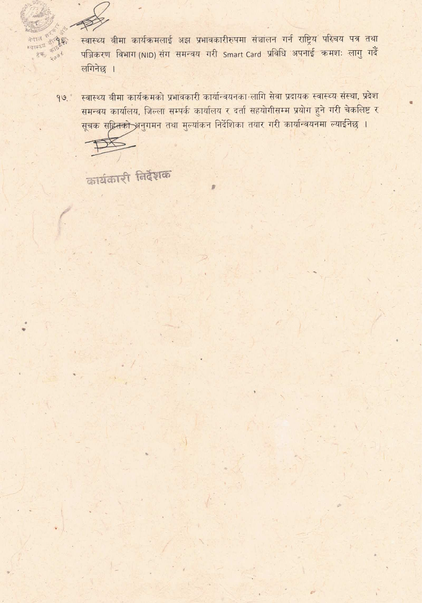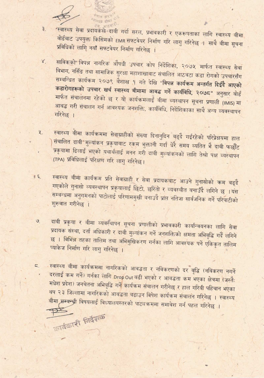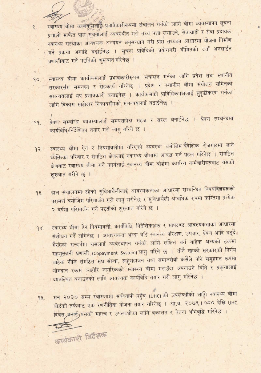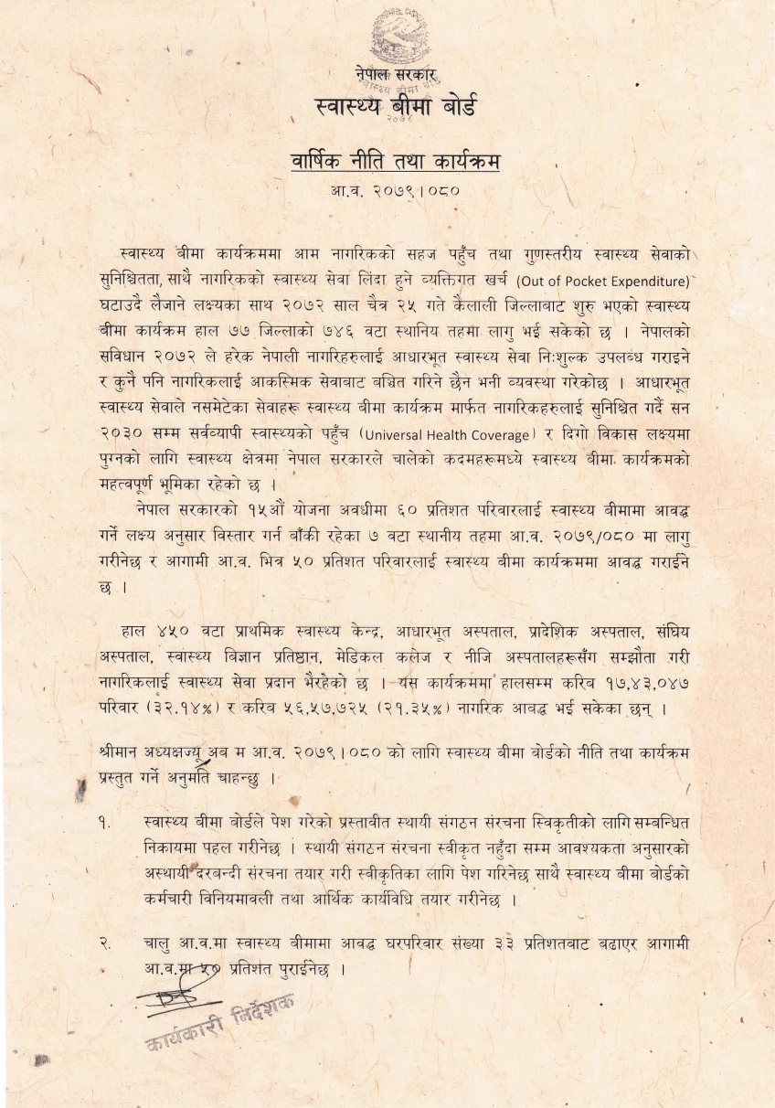 बोर्डले आफ्नो नीति तथा कार्यक्रममा बोर्डको स्थायी संघठन संचरनालाई यस वर्ष पुरा गर्ने कार्यक्रम बनाएको छ । यस आर्थिक वर्षमा स्वास्थ्य बीमामा आवद्ध घरपरिवारको संख्या ३३ प्रतिशतबाट ५० प्रतिशत पुर्याउने लक्ष्य लिएको छ । बीमा दाबीलाई सरल र सहज बनाउन नयाँ सफ्टवेयर निर्माण गर्ने कार्यक्रम बनाएको छ ।
