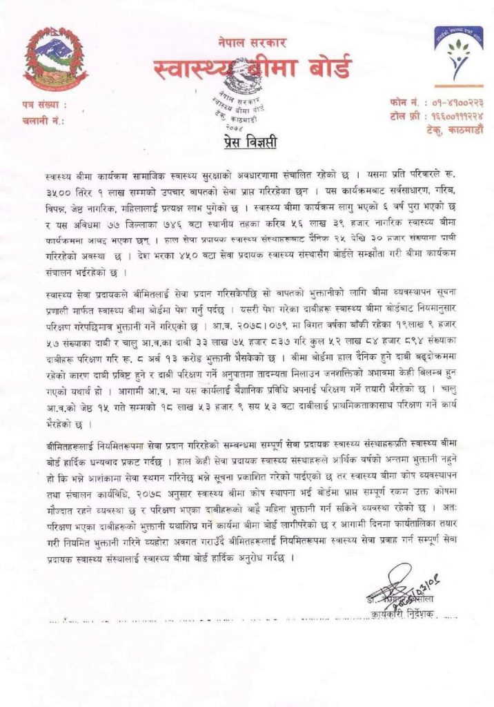 राजधानी काठमाण्डौंको साथै पूर्वी जिल्लाका केही ठूला अस्पतालहरुले लामो समयदेखि स्वास्थ्य बीमा कार्यक्रम अन्तर्गतको दाबी भुक्तानी प्राप्त नभएको कारण जनाउँदै सेवा स्थगन गर्ने घोषणा गरेपछि बोर्डले विज्ञप्ती जारी गर्दै यस्तो आग्रह गरेको हो । असारमसान्तसम्म फछ्र्यौट नभएपनि बोर्डलाई प्राप्त हुने सरकारी बजेट फ्रिज (फिर्ता) नहुने भएकाले भुक्तानी सम्बन्धमा आशंका नगर्न बोर्डका कार्यकारी निर्देशक डा। दामोदर बसौलाले आग्रह गरेका छन् ।