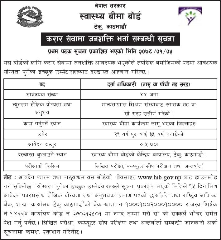 काठमाडौं । स्वास्थ्य बीमा बोर्डले विभिन्न पदका लागि करार सेवामा कर्मचारीको माग गरेको छ । बोर्डले बोर्डले तर्दा अधिकारी (नासू वा पाँचौ तह सरह) का लागि ४४ जना कर्मचारी माग गरेको छ । बोर्डले स्वास्थ्य बीमा कार्यक्रम लागु भएका जिल्लाहरुमा काम गर्नका लागि कर्मचारी माग गरेको जनाएको छ ।