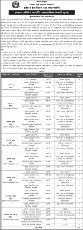 काठमाडौं । स्वास्थ्य र जनसंख्या मन्त्रालयले विभिन्न पदका लागि कर्मचारी माग गरेको छ ।स्वास्थ्य मन्त्रालयद्वारा स्वास्थ्य प्राविधिक जनशक्तिको आवश्यकता रहेकाले करारमा विभिन्न पदका लागि कर्मचारी माग गरेको हो । मन्त्रालयले सातै प्रदेशका लागि विभिन्न पदका लागि करारामा कर्मचारी माग गरेको हो ।