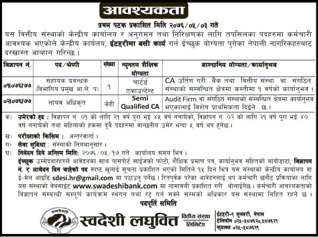 काठमाडौँ । स्वदेशी लघुवित्त वित्तीय संस्थाले विभिन्न पदमा कर्मचारी माग गरेको छ । संस्थाले सहायक प्रबन्धक (विभागिय प्रमुख आ.ले.प) पदमा एक जना कर्मचारी माग गरेको हो । त्यस्तै, संस्थाले नायव अधिकृत पदमा केही संख्यामा कर्मचारी माग गरेको छ ।