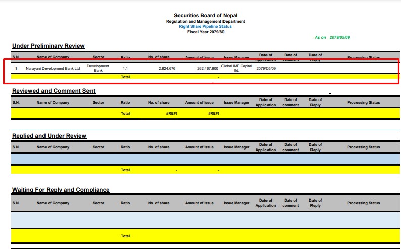 काठमाडौं । नारायणी डेभलपमेन्ट बैंकले १ः१ को अनुपातमा हकप्रद शेयर निष्काशन तथा विक्रीका लागि नेपाल धितोपत्र बोर्डमा निवेदन पेश गरेको छ । बैंकले प्रतिकित्ता अंकित मुल्य १०० रुपैयाँ दरमा २६ लाख २४ हजार ६७६ कित्ता हकप्रद शेयर निष्काशन गर्नको लागि नेपाल धितोपत्र बोर्डमा भदौ ९ गते निवेदन दिएको हो।