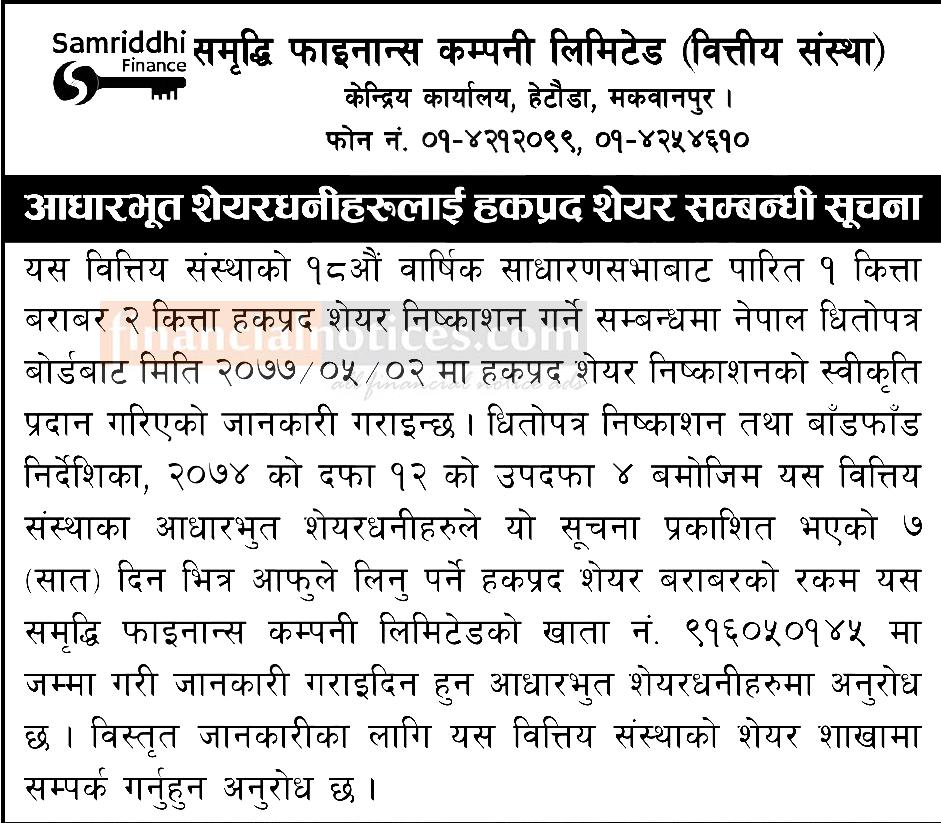 हकप्रद शेयरको रकम जम्मा गर्न समृद्धि फाइनान्सको आग्रह