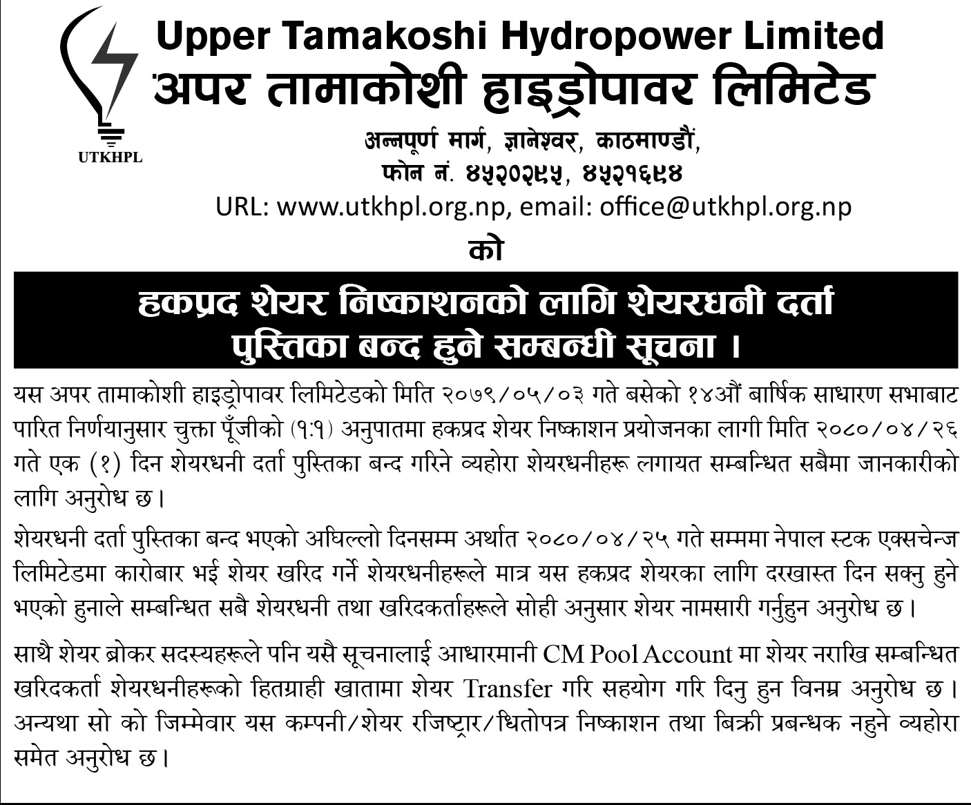 अपर तामाकोशीको हकप्रदको निष्काशन तथा बिक्री प्रबन्धकमा नागरिक लगानी कोष र सनराइज क्यापिटल छन्। हाल अपर तामाकोशीको चुक्तापुँजी १० अर्ब ५९ करोड रुपैयाँ रहेको छ। हकप्रद शेयर बिक्रीपछि कम्पनीको चुक्तापुँजी २१ अर्ब १८ करोड रुपैयाँ पुग्नेछ।
