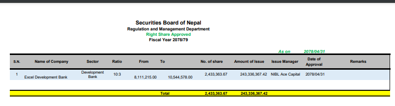 काठमाडौं । एक्सेल डेभलपमेन्ट बैंक लिमिटेडले हकप्रद शेयर निष्काशनका लागि नियामक निकाय नेपाल धितोपत्र बोर्डबाट स्वीकृति पाएको छ । बैंकले हाल कायम चुक्ता पुँजी १०ः३ को अनुपातमा एक सय रूपैयाँ अंकित दरमा ३० प्रतिशतले हुन आउने २४ करोड ३३ लाख ३६ हजार ३ सय ६७ रुपैयाँ ४२ पैसा बराबरको २४ लाख ३३ हजार ३ सय ६३ दशमलव ६७४२ कित्ता हकप्रद शेयर निष्काशनका लागि अनुमति पाएको छ । कम्पनीले यक्त हकप्रद शेयर निष्काशनका लागि आज अनुमति पाएको हो ।