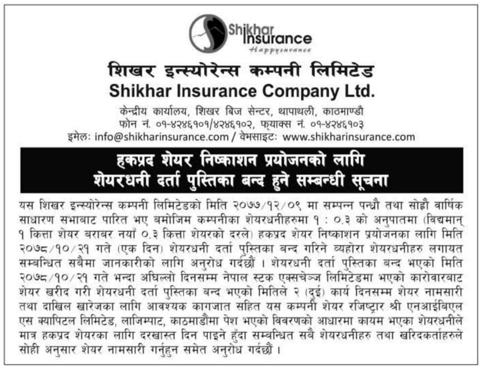 काठमाडौं । शिखर इन्स्योरेन्स कम्पनीले हकप्रद शेयर निष्काशन प्रयोजनको लागि बुक क्लोज मिति तय गरेको छ । कम्पनीले हकप्रद शेयर निष्काशनको लागि माघ २१ गते बुक क्लोज गर्ने एक सुचना जारी गर्दै जनाएको छ । बुक क्लोजको आधारमा माघ २० गते कायम शेयरधनीले मात्र हकप्रद शेयरमा आवेदन दिन सक्ने छन् ।