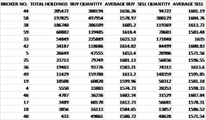 विगत एक महिनाको अवधिमा १६ वटा ब्रोकरले ८ लाख ४८ हजार ९५२ कित्ता शेयर होल्ड गरेर राखेका छन् । सबैभन्दा धेरै ४४ नम्बरको ब्रोकरले २ लाख ५ हजार कित्ता शेयर खरिद गरेर राखेको छ । यस ब्रोकरले पछिल्लो समय शेयर उठाइरहेको देखिन्छ । यस ब्रोकरको होल्डिङ रहेको शेयरको औषत मूल्य नै १६३६ रुपैयाँ छ ।