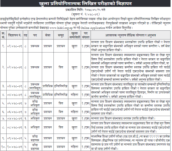 काठमाडौं । हाइड्रोइलेक्ट्रिसिटी इन्भेष्टमेन्ट एन्ड डेभलपमेन्ट कम्पनी (एचआईडिसीएल) ले स्थायी पदपूर्तिका लागि कर्मचारीको मागगरेको छ । लोकसेवा आयोगमार्फत लिइने परीक्षाका लागि कम्पनीले एक सुचना जारी गर्दै बताएको छ ।