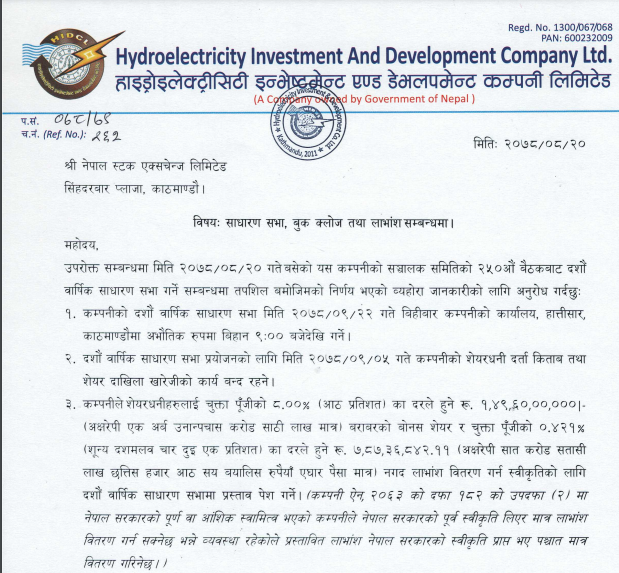 कम्पनीले साधारणसभा प्रयोजनको लागि पुस ५ गते बुक क्लोज गर्नेभएको छ । त्यसकारण पुस ४ गतेसम्म कायम शेयरधनीले मात्र सभामा भाग लिन तथा प्रस्तावित लाभांश पाउन सक्ने छन् ।