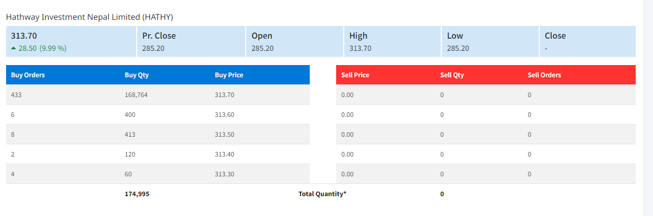 काठमाडौं । हाथवे इनभेष्टमेण्ट नेपालको शेयर नेप्सेमा आज पहिलो पटक कारोबार भएको छ ।  नेप्सेले पहिलो शेयर कारोबारको लागि ९५ रुपैयाँ ०९ पैसा देखि २८५ रुपैयाँ २७ पैसा को रेञ्ज दिएकोमा कम्पनीको पहिलो कारोबार २८५ रुपैयाँ २० पैसामा भएको थियो । नियमित सेसनमा आउँदा कम्पनीको बजार मूल्यले सर्किट लगाउँदै ३१३ रुपैयाँ ७० पैसा पुगेको छ । यो समाचार तयार हुँदासम्म कम्पनीको सर्किट लेभलमा लाखौ कित्ता बायर छन् तर विक्री तर्फ शुन्य संख्या छ ।