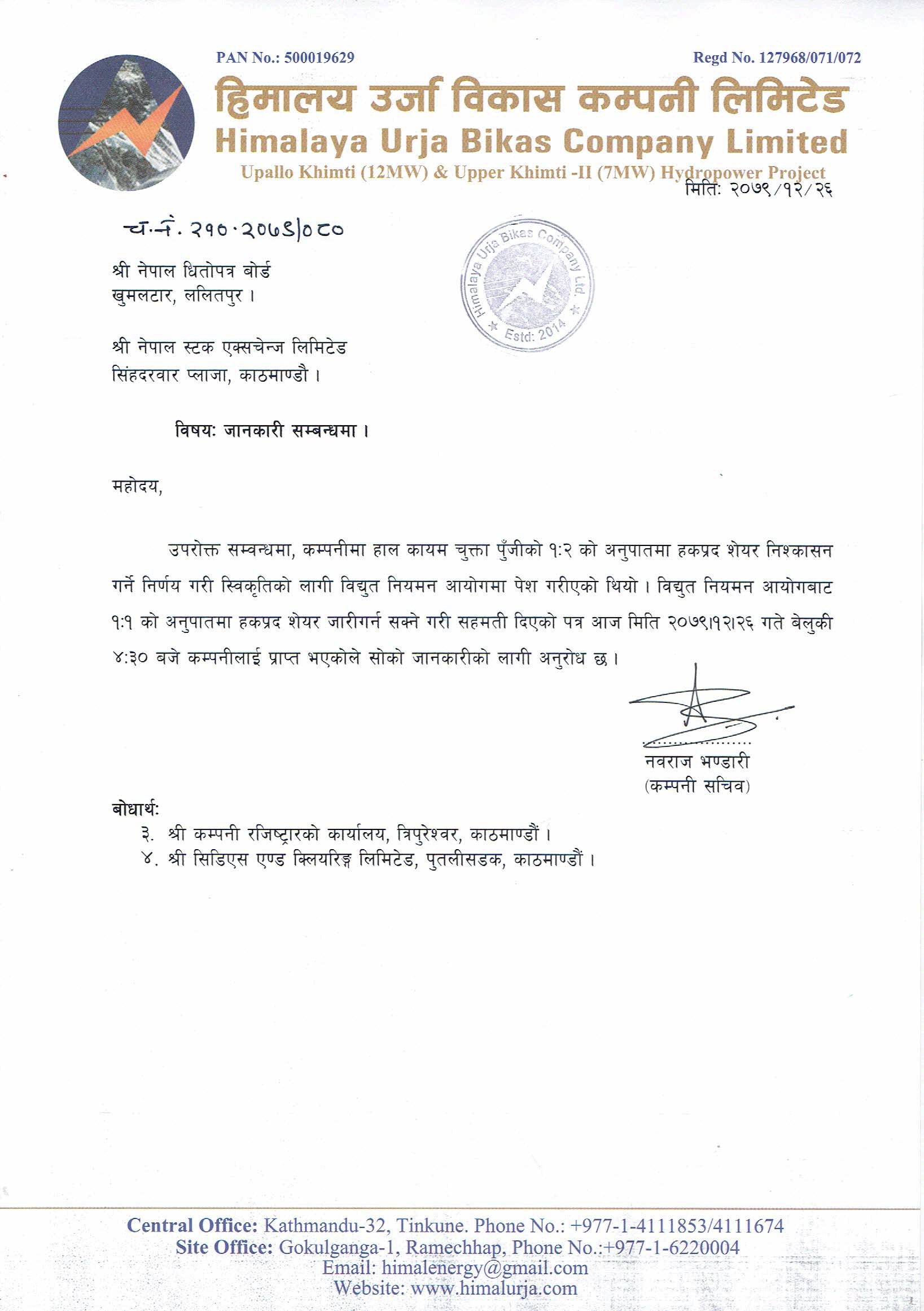 काठमाडौ. । हिमालयन उर्जा विकास कम्पनी लिमिटेडले शतप्रतिशत हकप्रद शेयर निष्काशन गर्ने भएको छ। यस अघि कम्पनीले २ सय प्रतिशत हकप्रद शेयर निष्काशन गर्ने घोषणा गरेको थियो। कम्पनीले गरेको उक्त निर्णयलाई विद्युत नियमन आयोग अस्वीकार गरी आयोगले शतप्रतिशत अर्थात १ बराबर १ अनुपातमा मात्र हकप्रद शेयर जारी गर्न स्वीकृती दिएको हो ।