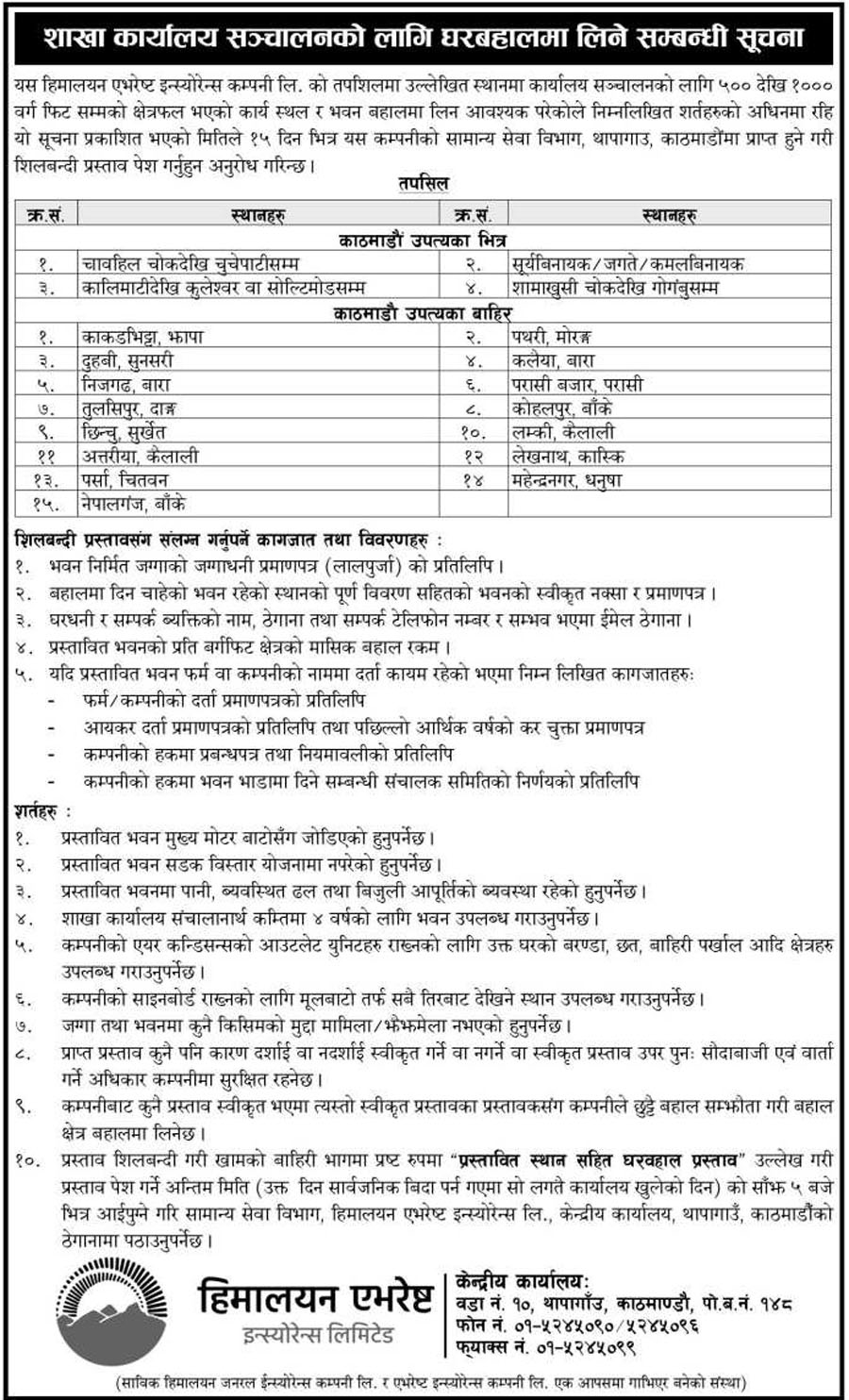 काठमाडौं । हिमालयन एभरेष्ट इन्स्योरेन्स कम्पनी लिमिटेडले १९ शाखा कार्यालय विस्तार गर्नका लागि घर भाडामा खोजेको छ । कम्पनीले उपत्यकाभित्र ४ स्थानमा र उपत्यका बाहिर १५ स्थानमा शाखा कार्यालय विस्तार गर्नका लागि घर भाडामा लिन शिलबन्दी प्रस्ताव पेश गर्न घरधनीहरुलाई आब्हान गरेको हो ।