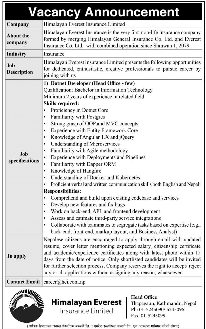 काठमाडौं । हिमालयन एभरेष्ट इन्स्योरेन्स लिमिटेडले कर्मचारी माग गरेको छ । कम्पनीले डोटनेट डेभलपर पदका लागि केहि संख्यामा कर्मचारी माग गरेको हो । कम्पनीले केन्द्रिय कार्यालयको लागि कर्मचारी माग गरेको जनाएको छ । उक्त पदमा आवेदन दिनको लागि स्नातक तह उत्तिर्ण गरेको तथा सम्बन्धीत क्षेत्रमा दुई वर्षको अनुभव हुनुपर्ने कम्पनीले जनाएको छ । ईच्छुक तथा योग्यता पुगेका उम्मेदवारले कम्पनीको इमेल मार्फत सुचना प्रकाशित भएको मितिले १५ दिनभित्र आवेदन दिन सक्नेछन् ।