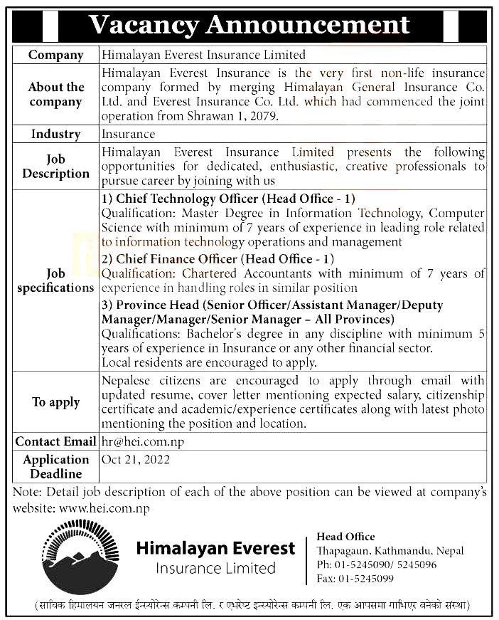 काठमाडौं । हिमालयन एभरेष्ट इन्स्योरेन्स लिमिटेडले विभिन्न पदका लागि सातै प्रदेशमा कर्मचारीको मगा गरेको छ । कम्पनीले एक सुचना जारी गर्दै हेड अफिसका लागि चिफ टेक्नोलोजी अफिसर एक जना, चिफ फाइनान्स अफिसर एकजना र सबै प्रदेशका लागि प्रदेश प्रमुख माग गरेको हो ।