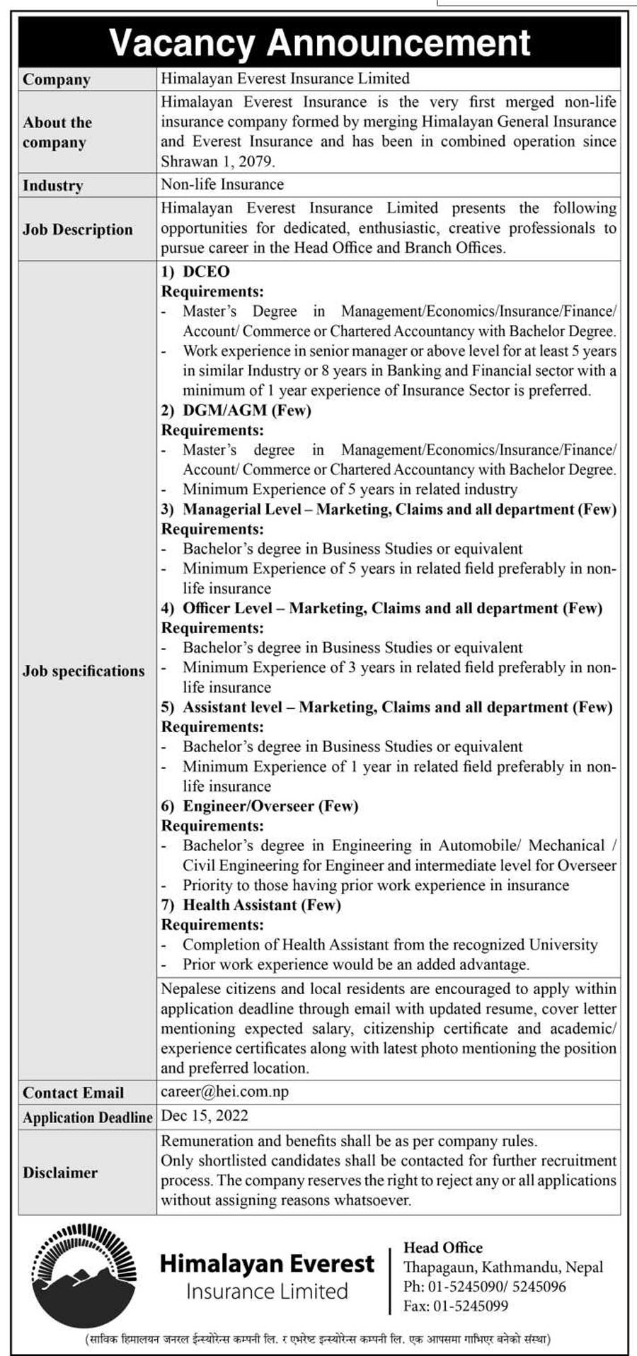 काठमाडौं । हिमालयन एभरेष्ट इन्स्योरेन्स लिमिटेडले विभिन्न पदका लागि कर्मचारीको माग गरेको छ । कम्पनीले डिसिइओमा एकजना, डिजिएम तथा एजिएमका लागि केही, म्यानेजरियल लेभल अल डिपार्टमेन्टका लागि केही, अफिसर लेभल मार्केटिङ क्लेम अल डिपार्टमेन्टका लागि केही, असिस्टेन्ट लेभल मार्केटिङ क्लेम अल डिपार्टमेन्टका लागि केही, इन्जिनियर तथा ओभरसियरका लागि केही र हेल्थ असिस्टेन्टका लागि केही संख्यामा माग गरेको हो ।