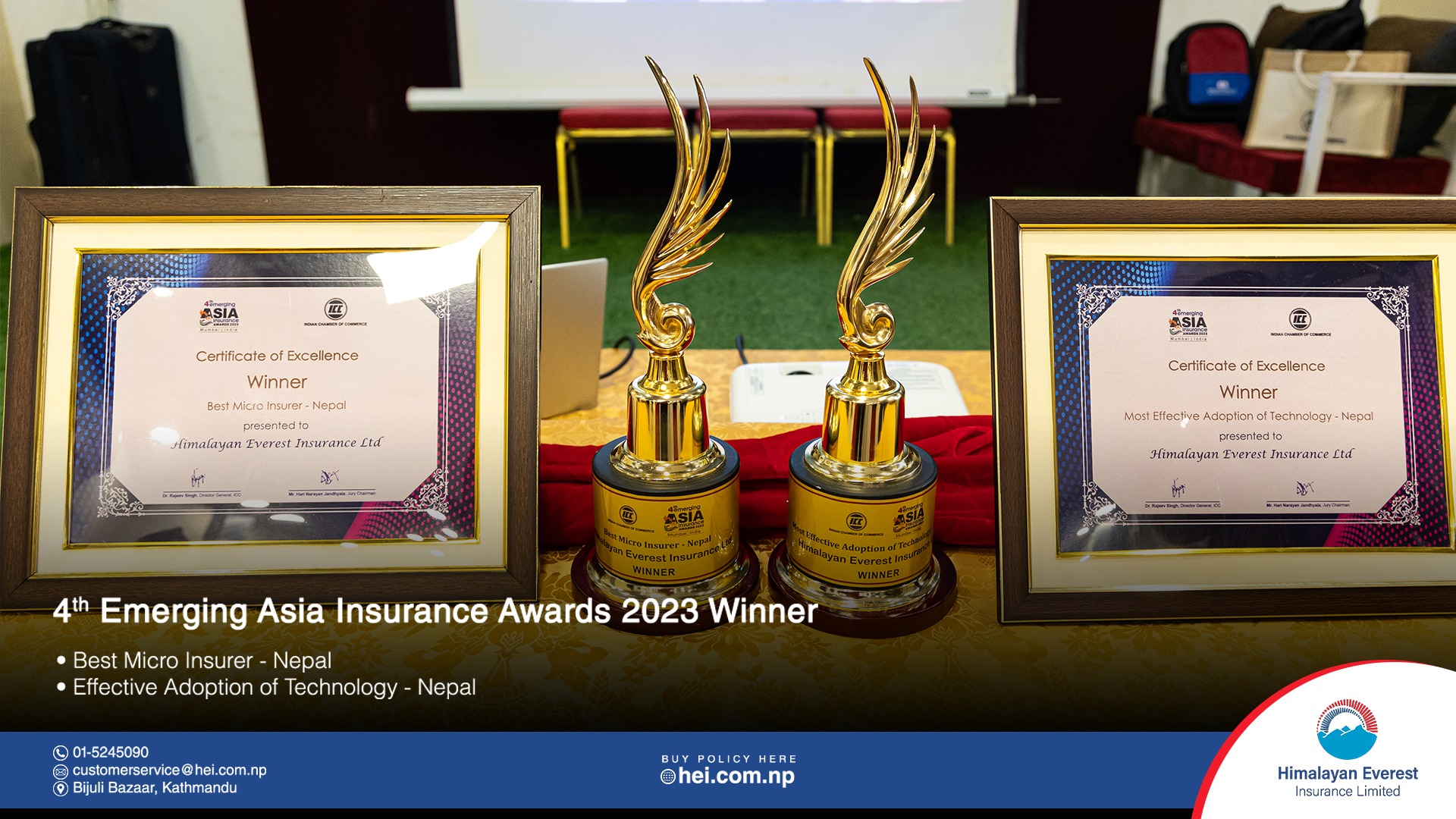 हिमालयन एभरेष्ट हालै भारतको मुम्बईमा भारतीय च्याम्बर अफ कमर्शद्वारा आयोजित चाैथो जिइमर्जिङ एशिया इन्योरेन्स अवार्डमा दुई फरक विधामा सम्मानित समेत भएको छ। कम्पनीले उत्कृष्ट नेपाली लघु बीमक र प्रविधिको सर्वाधिक प्रभावकारी ग्रहणकर्ता उपाधीबाट सम्मानित भएको हो।