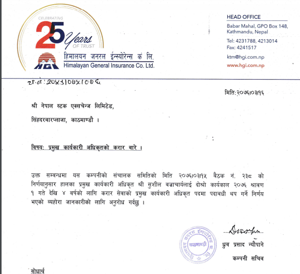 हिमालयन जनरल इन्स्योरेन्स कम्पनी लिमिटेडको प्रमुख कार्यकारी अधिकृत(सिइओ) मा सुशील बज्राचार्य पुनः नियुक्त भएका छन् ।