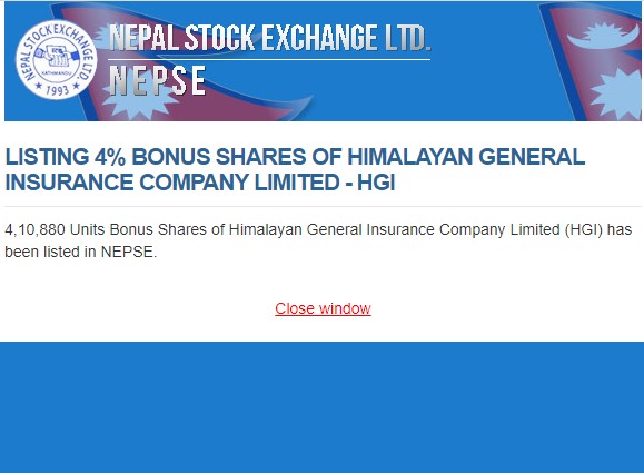 काठमाडौं । नेपाल स्टक एक्सचेञ्ज(नेप्से) मा आज हिमालयन जनरल इन्स्योरेन्सको बोनस शेयर सूचीकृत भएको छ । कम्पनीको चार लाख १० हजार ८ सय ८० कित्ता बोनस शेयर सूचीकृत भएको हो । उक्त शेयर शेयरधनीले डिम्याट खातामा आएपछि खरीद विक्री गर्न सक्नेछन् ।