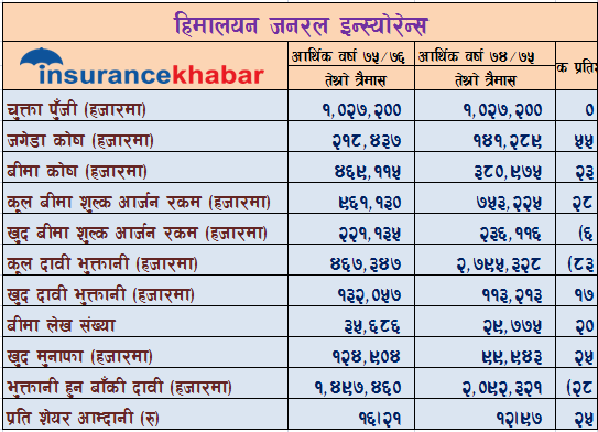 हिमालयन जनरल इन्स्योरेन्सले चालु आर्थिक वर्षको तेश्रो त्रैमासको वित्तिय विवरण सार्वजनिक गरेको छ । कम्पनीले आर्थिक वर्ष ७५/७६ को तेश्रो त्रैमास सम्म ९६ करोड ११ लाख कुल बीमा शुल्क आर्जन गरेको छ । कम्पनीले अघिल्लो आर्थिक वर्षको तेश्रो त्रैमास सम्म ७५ करोड ३२ लाख कुल बीमा शुल्क आर्जन गरेको थियो । कुल बीमा शुल्क आर्जन रकम २८ प्रतिशतले वृद्धि भएको छ । त्यस्तै कम्पनीले २२ करोड ११ लाख खुद बीमा शुल्क आर्जन गरेको छ । खुद बीमा शुल्क आर्जन रकम ६ प्रतिशतले घटेको छ ।