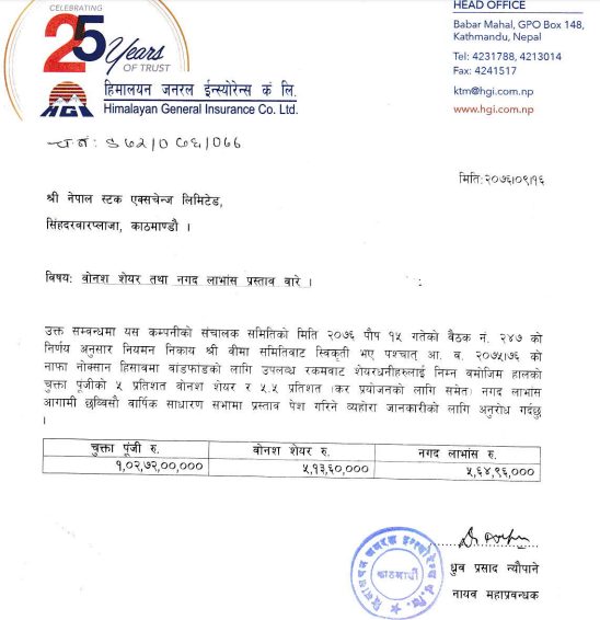 काठमाडौँ । हिमालयन जनरल इन्स्योरेन्सले लाभांश प्रस्ताव गरेको छ । कम्पनीले गत आर्थिक वर्ष २०७५/७६ को मुनाफाबाट लाभांश प्रस्ताव गरेको हो । इन्स्योरेन्सको पुस १५ गते मंगलबार बसेको २४७ औं बैठकले हाल कायम चुक्ता पूँजीको ५ प्रतिशत बोनश शेयर र ५.५ प्रतिशत कर सहित नगद लाभांश गरी १०.५ प्रतिशत लाभांश प्रस्ताव गरेको हो ।