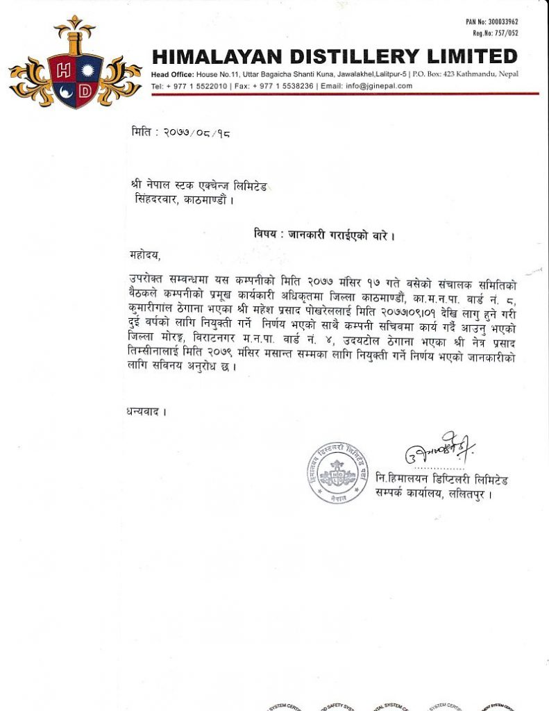 त्यस्तै, कम्पनी सचिवको जिम्मेवारी समाल्दै आएका नेत्र प्रसाद तिम्सीनालाई विसं २०७९ मंसिर मसान्तसम्मका लागि नियुक्त गर्ने निर्णय भएको कम्पनीले सूचना मार्फत जनाएको छ ।
